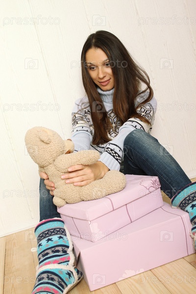 Привлекательная молодая женщина дома с плюшевым мишкой