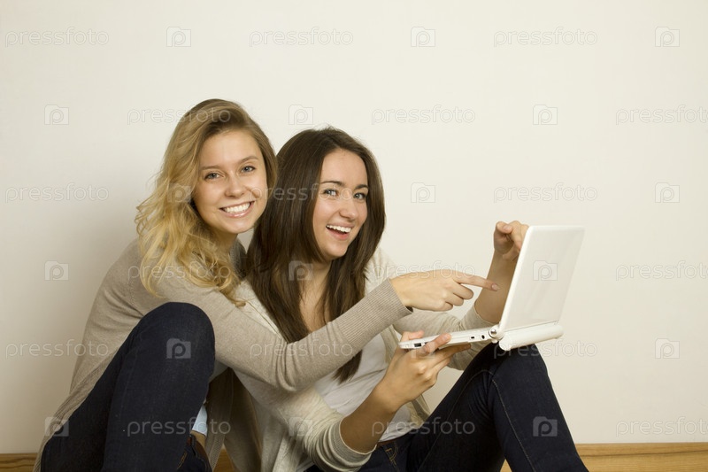 Две привлекательные подруги сидят дома с ноутбуком