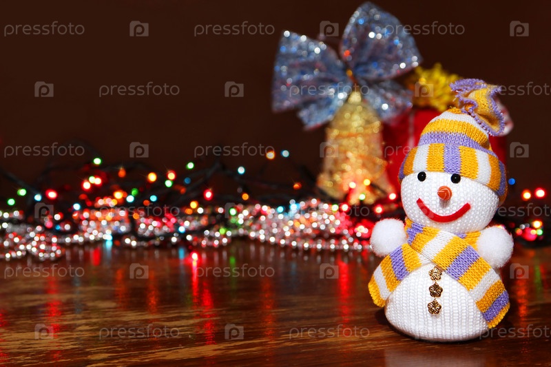 Разноцветный фон с рождественскими украшениями и снеговиком
