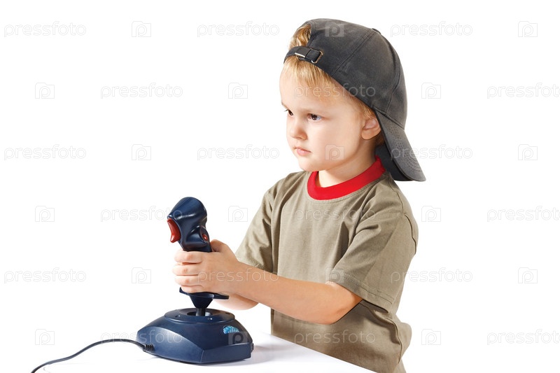 Маленький мальчик играет с джойстиком на белом фоне