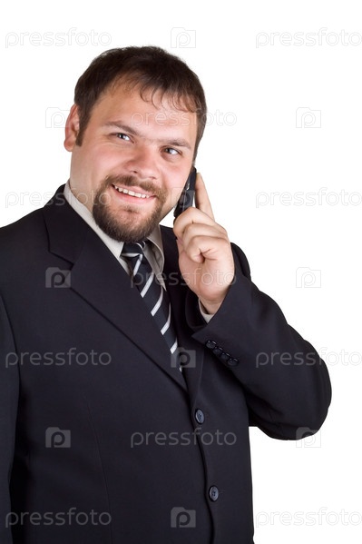 Бизнесмен говорит по мобильному телефону на белом фоне