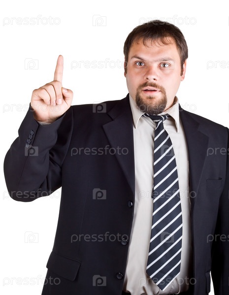 Бизнесмен с поднятым указательным пальцем на белом фоне