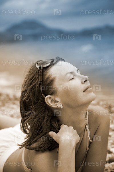 Девушка лежит на пляже Черного моря в Крыму