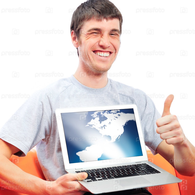 Портрет улыбчивого мужчины с ноутбуком на диване