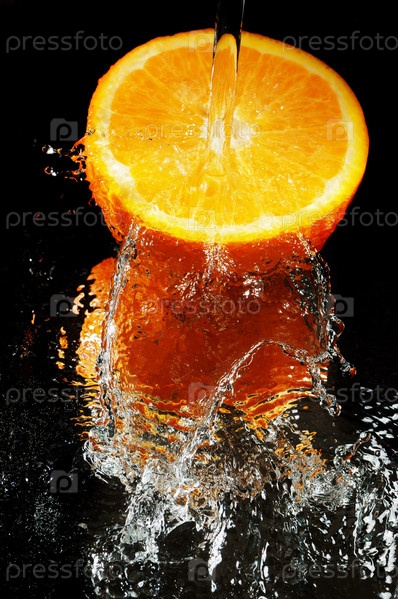 Апельсин под стуей воды на черном фоне