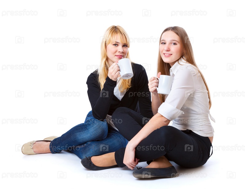Две девочки-подростки пьют чай, изолированные на белом фоне