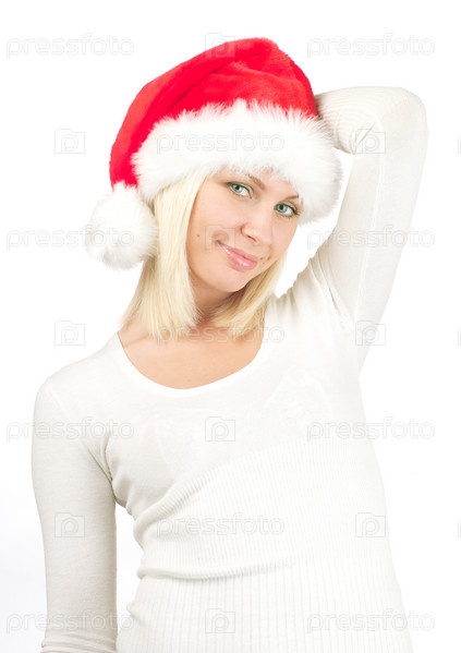 Портрет красивой женщины в шляпе Санты на белом фоне