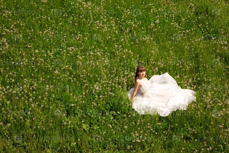 Красивая девушка в белом платье сидит посреди поля