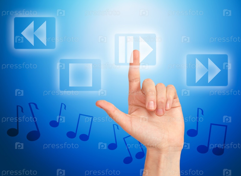 Рука, нажимающая на кнопки, и музыкальные ноты на синем фоне