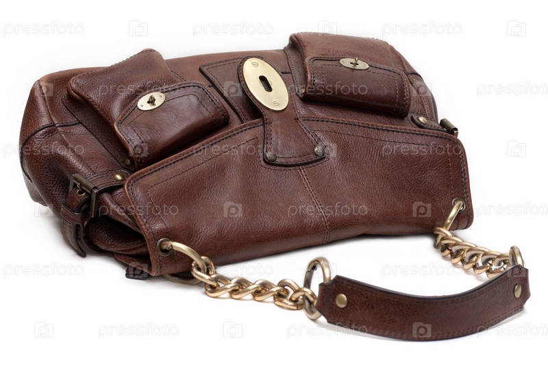 Красивая женская сумка из коричневой кожи с золотой цепной ручкой и замком, изолированным на белом фоне