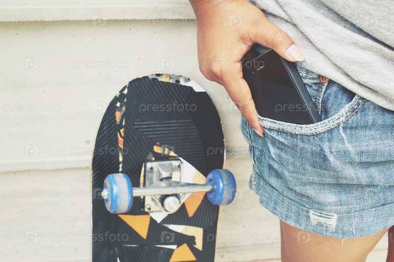 Девушка со Смартфон и скейтбордом