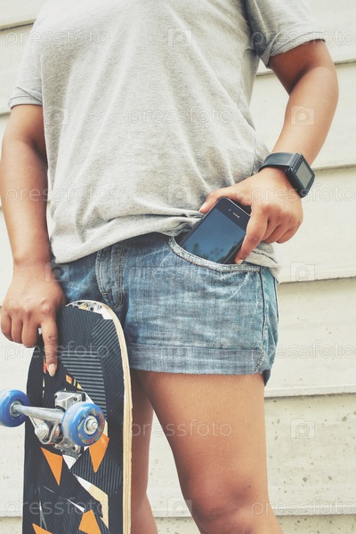 Девушка со Смартфон и скейтбордом