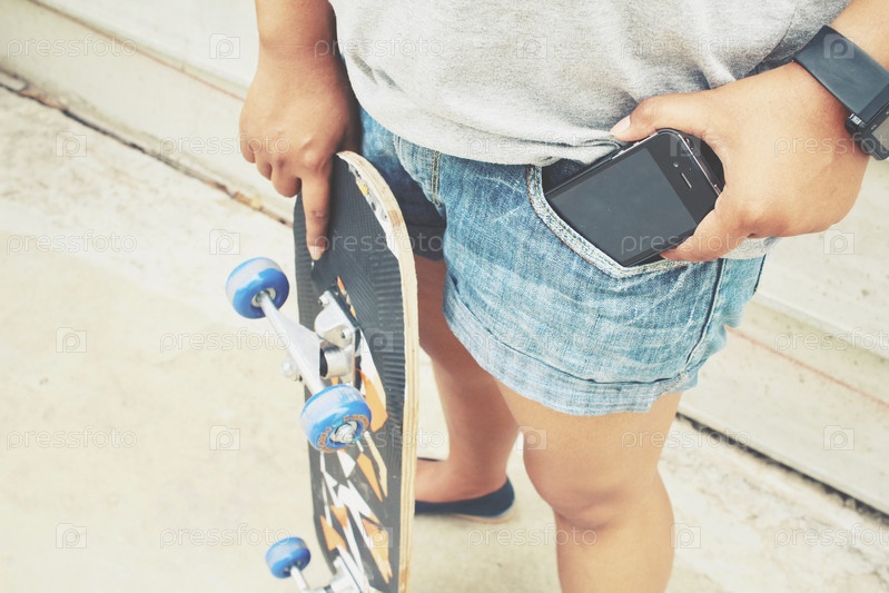 Девушка со смарфоном и скейтбордом