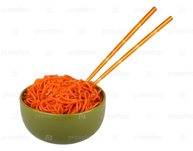 Салат из моркови в зеленой миске с палочками