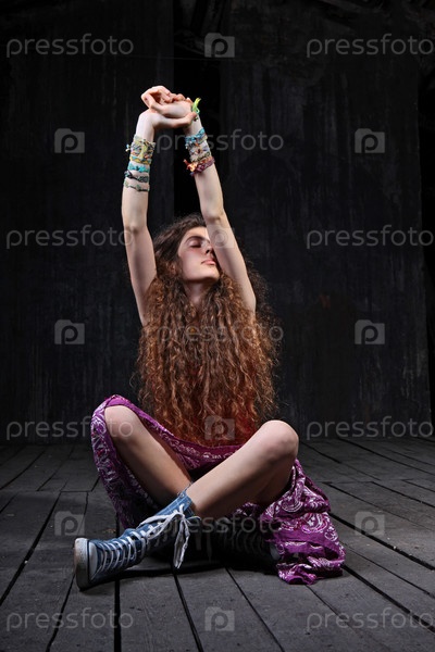 Привлекательная молодая женщина сидит на деревянном полу в студии