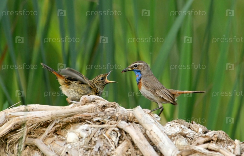 Варакушка кормит птенца