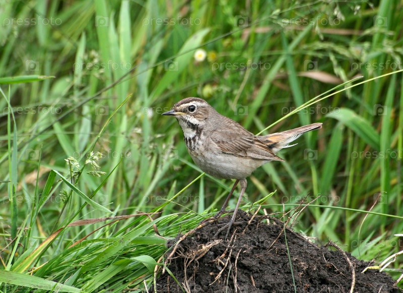Птица (Luscinia svecica, варакушка) стоит на земле в траве