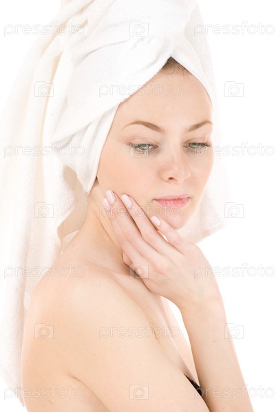 Портрет женщины в полотенце на белом фоне