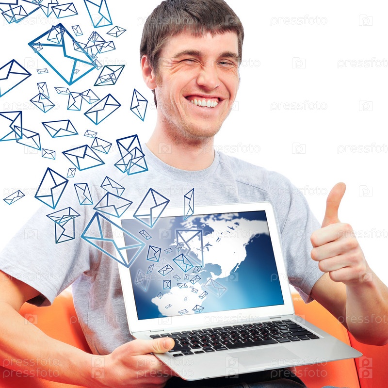 Мужчина с ноутбуком, из которого вылетают значки писем