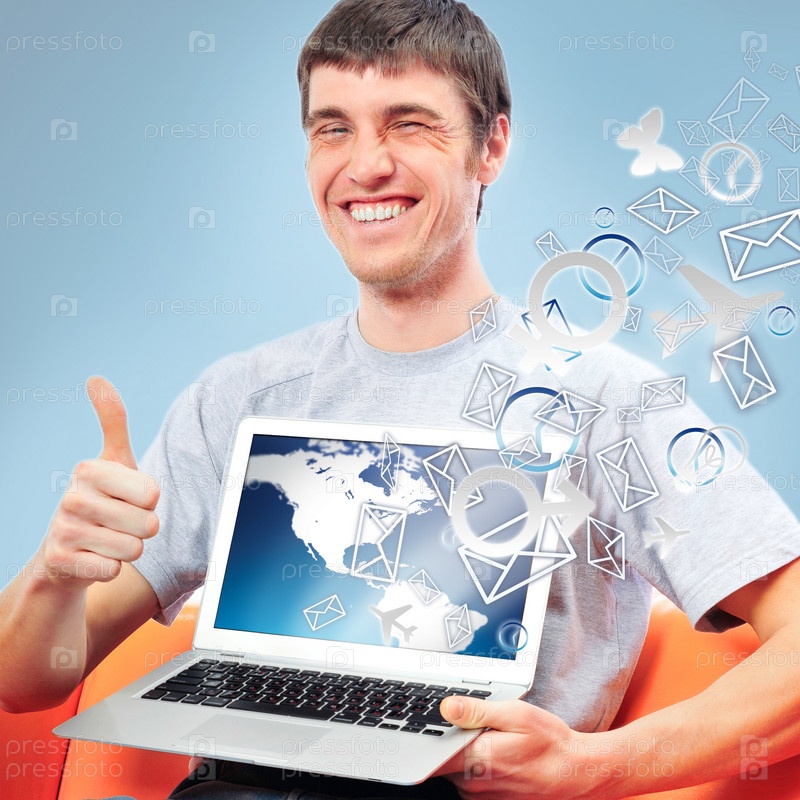 Мужчина с ноутбуком, из которого вылетают значки писем