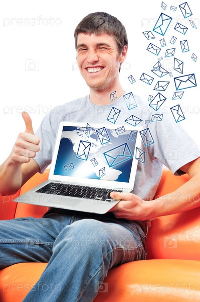 Мужчина с ноутбуком, из которого вылетают значки писем