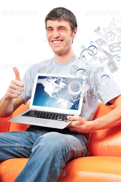 Мужчина с ноутбуком, из которого вылетают разные значки