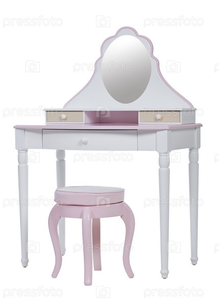 Розовый туалетный стол с зеркалом и розовым пуфом, изолированные на белом фоне
