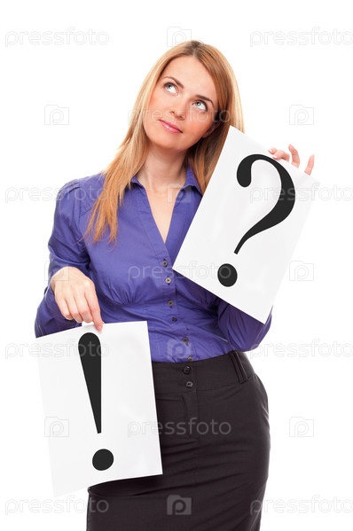 Женщина с восклицательным и вопросительным знаками на белом фоне