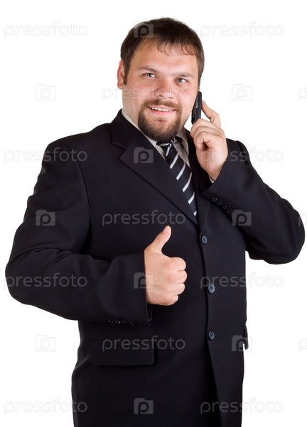 Бизнесмен с мобильным телефоном демонстрирует жест "ОК"
