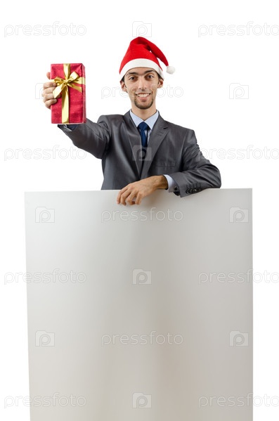 Портрет молодого человека в рождественском колпаке с плакатом для сообщения