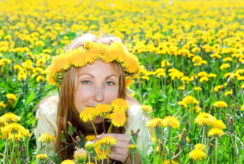 Девушка лежит в поле одуванчиков