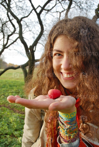 Женщина держит в руке маленькое красное яблоко