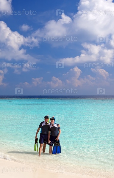 Отец с сыном в море с оборудованием для подводного плавания