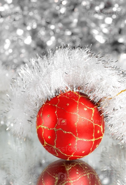 Красный шар с мишурой на фоне размытого серебристого украшения