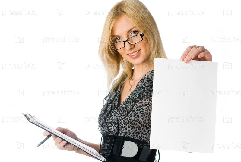 Портрет молодой, красивой девушки с листом бумаги, на белом фоне