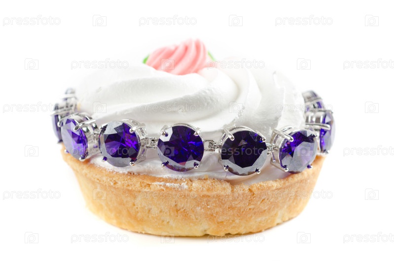 Пирожное, украшенное браслетом с синими камнями, на белом фоне
