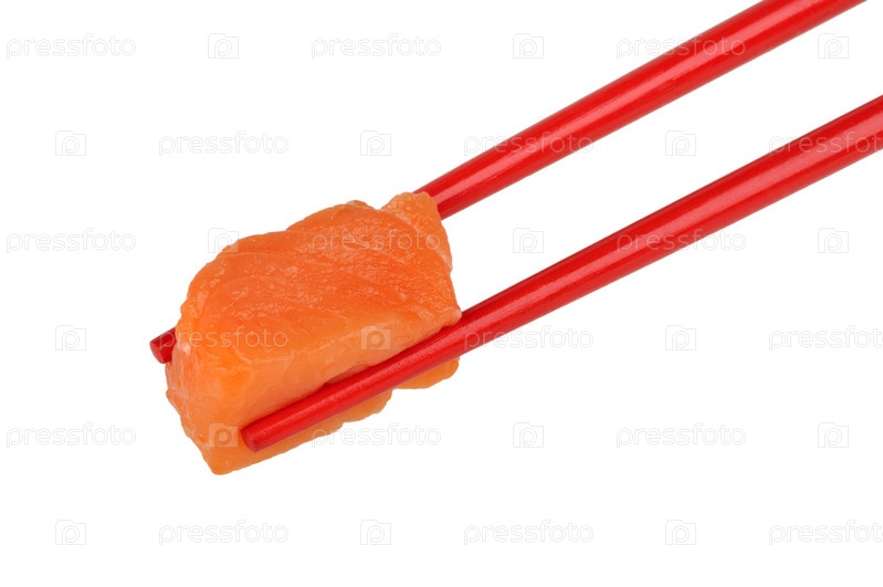 Кусочек лосося между красными палочками на белом фоне
