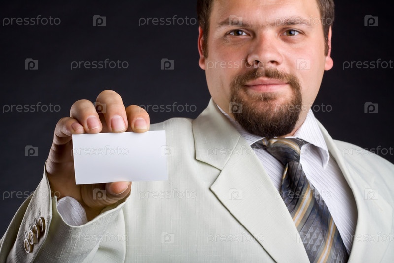 Мужчина показывает визитную карточку на темном фоне