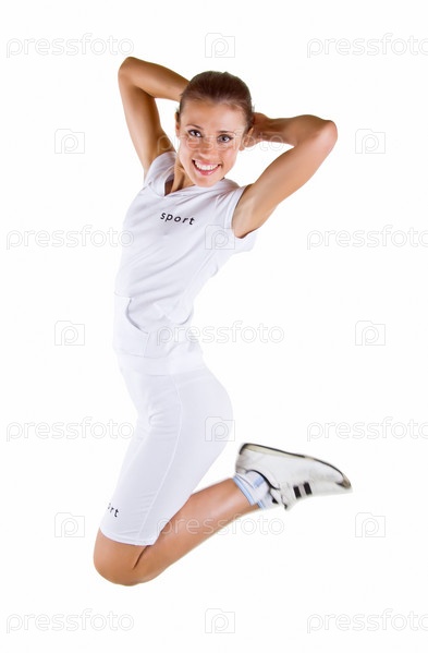 Прыжок девушка в белой форме на белом фоне