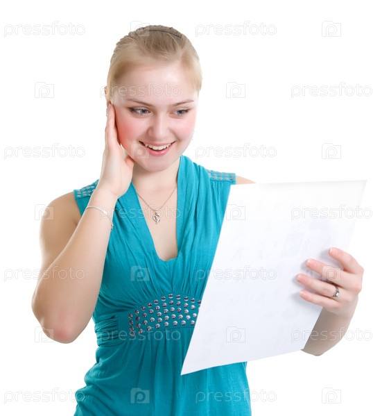 Счастливая школьница получила диплом. Изолировано на белом фоне