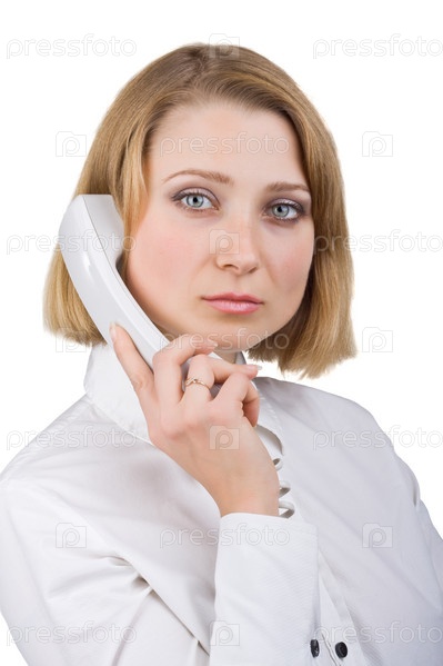 Деловая женщина в белой блузке с трубкой в руке на белом фоне