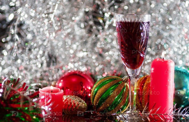 Бокал красного вина, елочные украшения и свечи