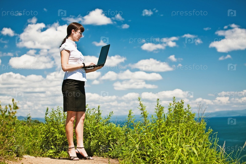 Красивая девушка с ноутбуком на природе
