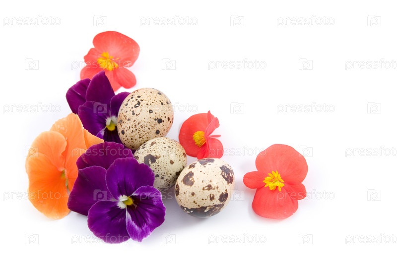 Перепелиные яйца с цветами на белом фоне