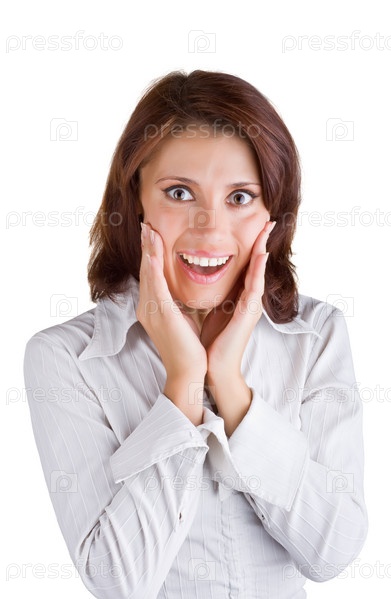 Красивая женщина очень удивлена, на белом фоне