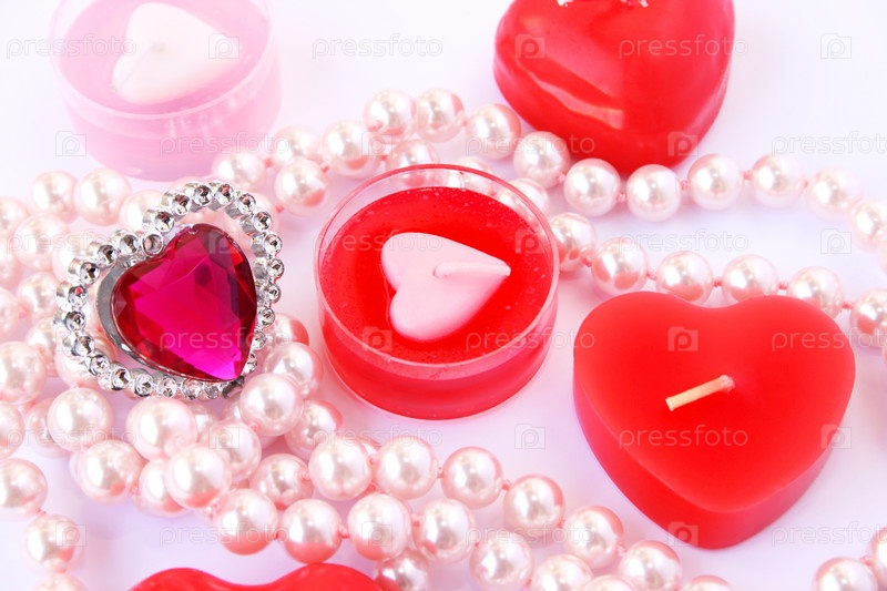 Свечи в виде красных сердец, драгоценный камень и ожерелье из жемчуга