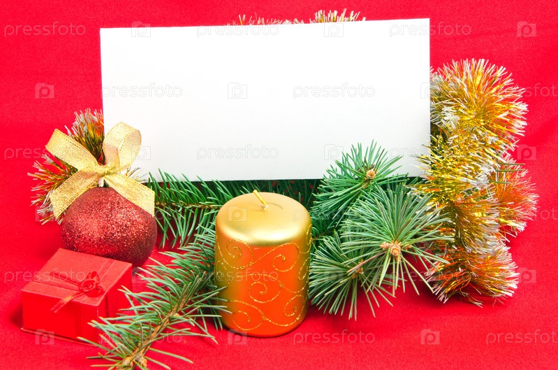 Рождественские украшения со свечой и белым листом на красном фоне