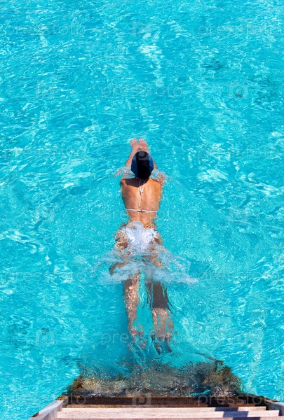Мальдивские Острова. Девушка плывет в голубом бассейне