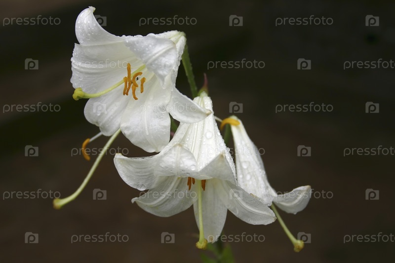 Три белых лилии, покрытые капельками росы, представлены на темном фоне