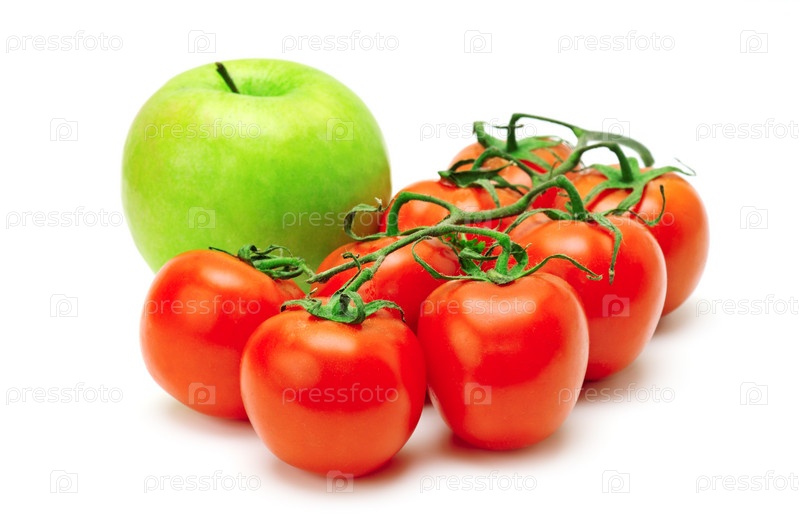 Яблоко и помидоры на белом фоне